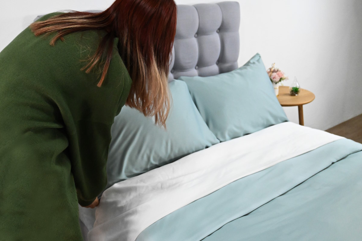 床單選用達 400 針數的有機竹纖維,柔軟度和質量能與 1,000 針數或以上的埃及長絨棉媲美。竹纖維床品擁有獨特的柔滑感,觸感如羽毛般輕盈,並且經久耐用。